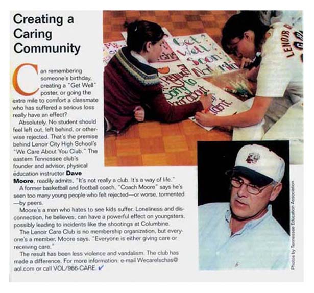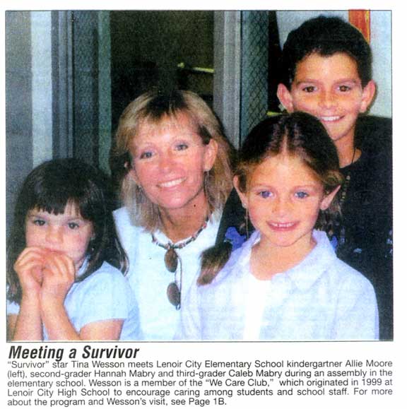 ........... ........... | ![]() ~ Care Connection ~ Caring Survives: We Care Clubs learn art of surviving from member Tina Wesson We Care Clubs in East Tennessee elementary and high schools learn about surviving from Tina Wesson, national "Survivor" celebrity from Knoxville. Wesson recently joined the ranks of supporters who visited students this year. "Coach Dave Moore's CARE project has proven its effectiveness within the school system," Wesson said recently. "I was fortunate enough to see its results personally when I went to visit the Lenoir City High School. "Never have I witnessed such universal kindness throughout the student body," she said. Phone: (865) 966-CARE